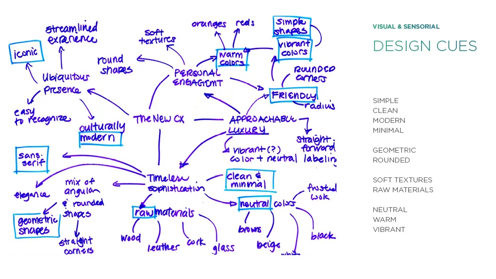The aesthetics of the short term strategy for Cathay feature bold material accents like copper and brass juxtaposed against a larger surface of black and white. The materials are color-blocked in an angular fashion to emphasize the dynamic energy in a subtle and refined way. This strategy focuses primarily on enhancing the premium experience of the airline.
