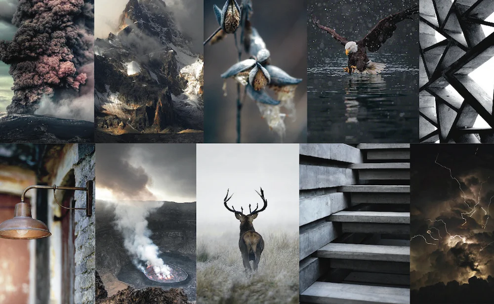 The rustic palette for mountain hunting is heavily inspired by organic textures of plants & animals in the forest.